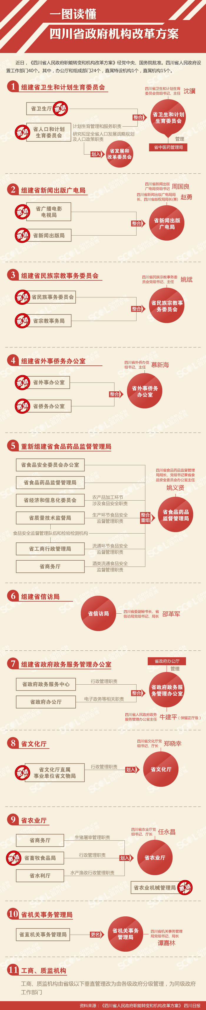 近日,《四川省人民政府职能转变和机构改革方案》经党中央、国务院批准。四川省人民政府设置工作部门40个。其中,办公厅和组成部门24个,直属特设机构1个,直属机构15个。