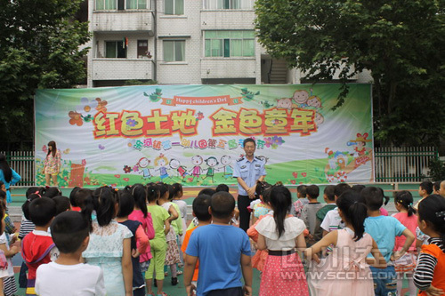 图为旺苍县公安局交警大队民警为旺苍县东河镇第一幼儿园的小朋友们讲解儿童交通安全知识。