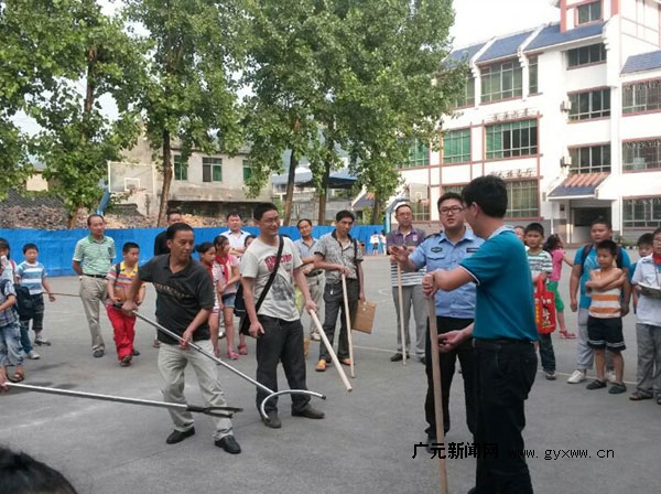 6月16日,旺苍县公安特巡警队与治城派出所民警在该县红军城东河小学向该校师生开展了校园防暴防恐工作专项宣教培训。公安干警对各类暴恐活动的成因、表象、防范、控制等方面作了细致的讲解,并进行了器械使用演练。(岳永莲 记者 向仕新)