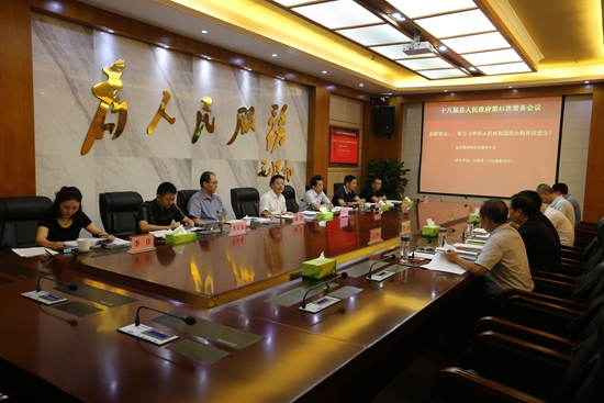 会前学习了《中华人民共和国民办教育促进法》,会议传达了四川省脱贫攻坚三年行动工作会议精神、市委市政府主要领导近期安全生产工作讲话精神,听取了1-8月全县安全生产工作情况汇报,审议并原则通过了《2018年度财政涉农资金统筹整合使用调整方案》《汉王山东河湿地省级自然保护区内水电站关闭拆除工作方案》《旺苍县茶产业发展扶持办法》《旺苍县2017—2020年特殊教育提升计划》《旺苍县第三期学前教育行动计划(2017—2020)》《农村地区学校、家庭、社会三结合教育机制改革试点实施方案》《旺苍经开区安全生产和职业健康监管职责方案》《旺苍县城区河道整治一期工程廊桥建筑项目规划建设方案》《旺苍县城嘉川至东河段公路工程采用政府与社会资本合作ppp协议(送审稿)》《旺苍县会展管理办法》《旺苍县商贸服务业发展扶持管理办法》《旺苍县关于检举“涉黑涉恶”违法犯罪问题线索奖励办法》,研究了拟供三江镇原二运公司等35个地块和2个新设矿权、旺苍县红军城市场与西城市场用地性质调整及规划指标、米仓山国家级自然保护区鼓道源整改工作、黄洋食品工业园区建设等有关事宜。