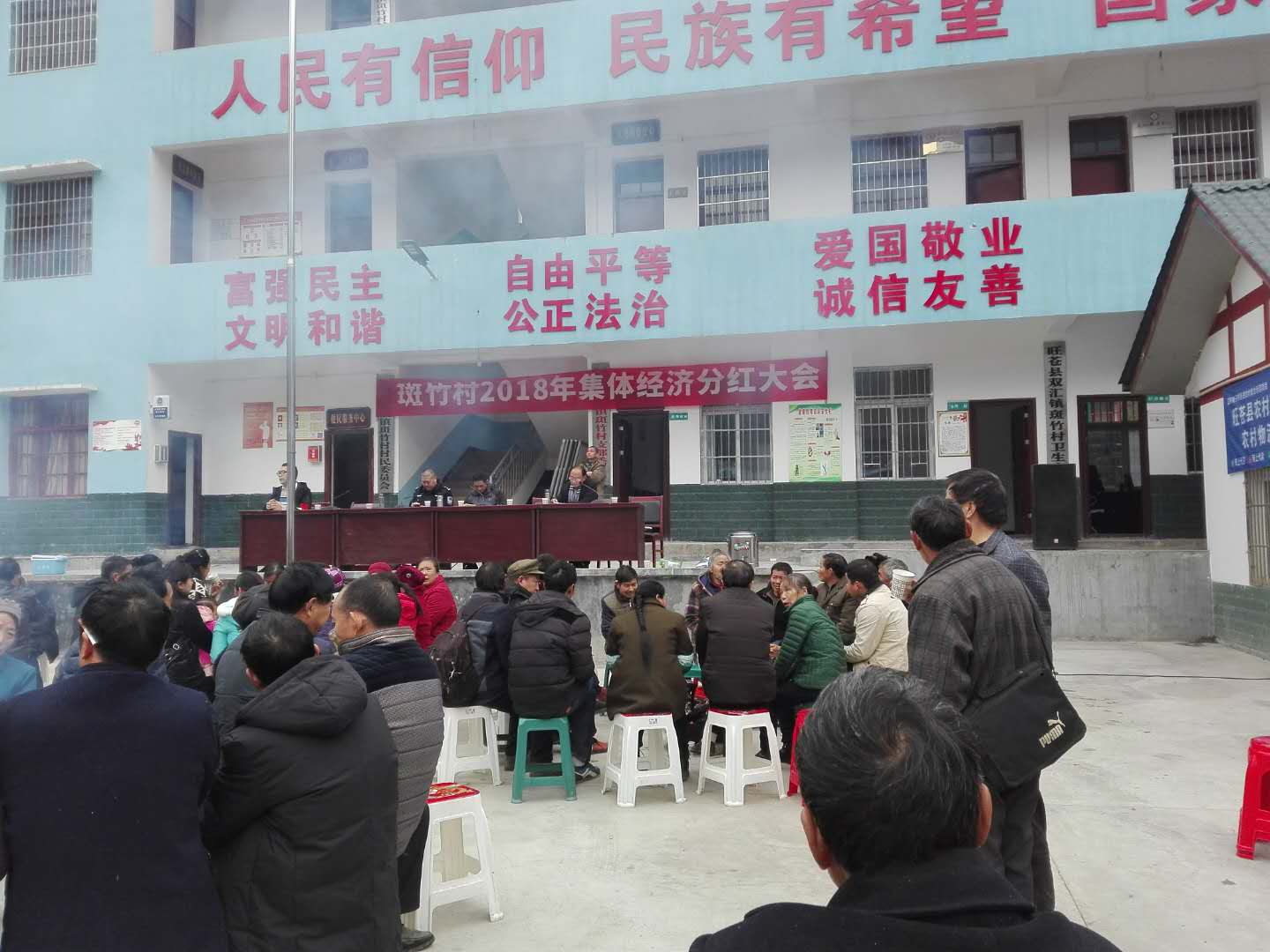12月14日, 斑竹村的65户建档立卡户和村委会迎来了村级集体经济红利首次分红。65户贫困户人均分到 51.53元,村委会分到11916.51元。斑竹村集体经济首次创收39721.17元。