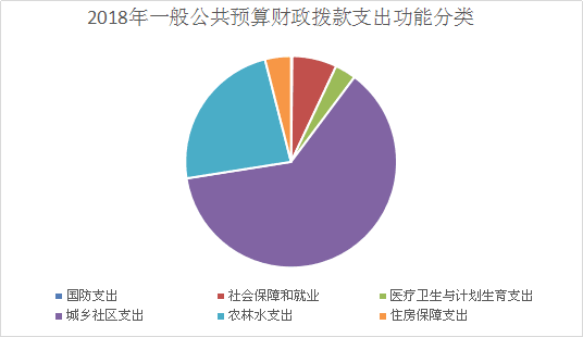 2018年一般公共预算财政拨款支出272.03万元,主要用于以下方面:国防支出(类)支出0.5万元,占0.18%;社会保障和就业(类)18.57万元,占6.83%;医疗卫生与计划生育支出(类)支出8.74万元,占3.21%;城乡社区支出(类)支出169.41万元,占62.28%;农林水支出64.01万元,占23.53%;住房保障支出10.80万元,占3.97%。