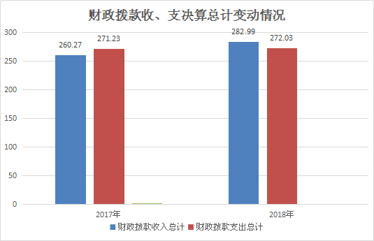 2018年财政拨款收入总计282.99元。与2017年260.27相比,财政拨款收入总计增加22.72万元增加8.73%。主要变动原因是增加政策性调资、项目资金增加。