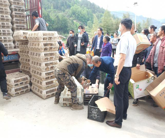 4月29日上午,英萃镇人民政府为中山、五岭、关嘴三个村的贫困户发放鸡苗助增收。