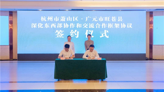 在萧山区—旺苍县东西部协作工作第二次联席会上,与会人员观看了杭州市萧山区宣传片,签订了杭州市萧山区—广元市旺苍县东西部协作和交流合作框架协议,举行了萧山区政府向旺苍县政府资金捐赠仪式。