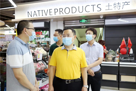 在粮贸超市,唐文辉一行实地检查了超市扫码、测温、戴口罩等防疫措施落实,详细询问了超市客流量、销售量、货物供应等情况。唐文辉指出,当前疫情形势依然严峻,超市等人员密集场所要严格落实好“一米线、戴口罩、测体温、查验健康码”等常态化疫情防控措施,扎实做好日常消毒消杀工作,加强冷链食品安全监管,严把商品、食品质量关,强化从业人员安全培训和安全防护,充分保障节日市场民生货源充足,确保市民过一个平安祥和、欢乐喜庆的国庆佳节。