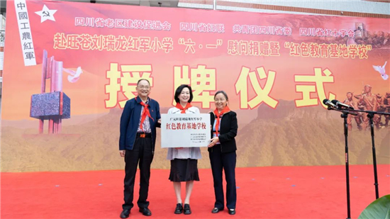 仪式上,省老促会会长董玉梅向旺苍刘瑞龙红军小学授“红色教育基地”牌匾。