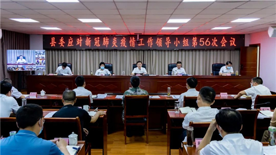 7月19日晚,县委召开应对新冠肺炎疫情工作领导小组第56次会议,传达学习近期中央、省、市领导关于疫情防控工作批示精神和相关会议精神,安排部署相关工作。县委书记、县委应对新型冠状病毒肺炎疫情工作领导小组组长唐文辉出席会议并讲话。他强调,全县各级各部门务必要深入学习习近平总书记关于疫情防控工作的重要指示精神,全面落实省委书记王晓晖批示要求和省委副书记、省长黄强在省应急指挥部疫情防控工作视频调度会上的讲话精神以及市委关于疫情防控的安排部署,保持清醒头脑,抓紧、抓实、抓细各项防控措施,真正把责任落实到最小工作单元,筑牢疫情防控铜墙铁壁。县委副书记、县长杜非主持会议。县委副书记李放出席会议。
