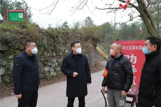在普陀寺社区森林防灭火劝导点,值守人员正在开展日常巡护工作,唐文辉上前与其亲切交谈,详细了解火源管控、火险监测、防灭火物资储备和防火宣传等工作开展情况,勉励大家在做好自身防护的同时坚守岗位,全力抓好森林防火各项工作。他强调,要时刻紧绷森林防灭火这根弦,加密林区监测和巡查巡护频次,全面排查治理各类风险隐患,切实筑牢森林防灭火安全屏障。要全覆盖开展森林防灭火宣传教育,做好“正反”两方面引导,落实留守儿童、精神病患者等重点群体一对一监护管理措施,从源头防范化解火灾风险。要加强应急值守,严格落实领导在岗带班、24小时值班和森林火灾信息报告等制度,畅通火情信息,切实做到“打早、打小、打了”。