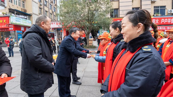 在电影院步行街,唐文辉代表县委、县政府向大家在过去一年为守护城市文明秩序、确保城市干净卫生作出的重要贡献表示衷心感谢,叮嘱大家要保重身体,在做好本职工作的同时,注重自身防寒保暖。他指出,长期以来,全县环卫工人、综合执法人员用勤劳的双手和辛勤的汗水扮靓大街小巷,为全县人民营造了舒适、整洁、优美的城市环境。希望大家在新的一年里继续发扬爱岗敬业、无私奉献的精神,持续优化城市环境、规范市容秩序,打造宜居宜业宜游精品城市,在旺苍创建国家卫生县和省级文明城市等工作中贡献更大力量。