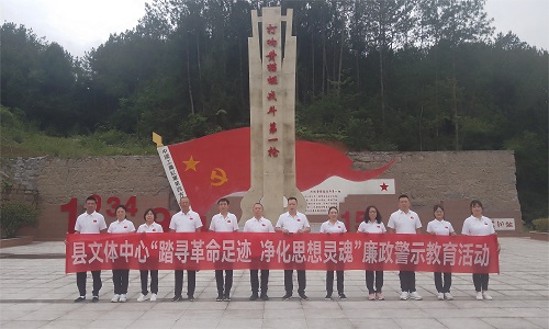 为庆祝中国共产党成立103周年,扎实推进党纪学习教育,进一步深化警示教育形式和内容,教育引导全体干部职工筑牢拒腐防变思想防线,提升党员干部纪律意识。6月27日,旺苍县文化体育中心前往中国红军城、黄猫垭战斗遗址、木门军事会议遗址开展“踏寻革命足迹 净化思想灵魂”廉政警示教育活动。