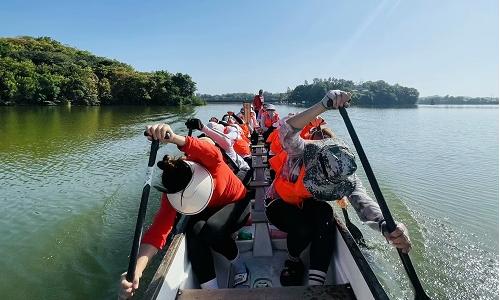 训练场上,激情与汗水交织。队员们精神抖擞,身着整齐的训练服,随着铿锵有力的鼓点响起,划手们全神贯注,双手紧握船桨、双臂紧绷发力,凤舟如离弦之箭在水上飞驰,船桨深深切入水中,激起片片白浪。训练过程中,划手们不断调整姿势、力度和节奏,在反复的练习中追求速度与协调的极致统一。那一声声高亢的“一二、一二”口号,在水面久久回响。