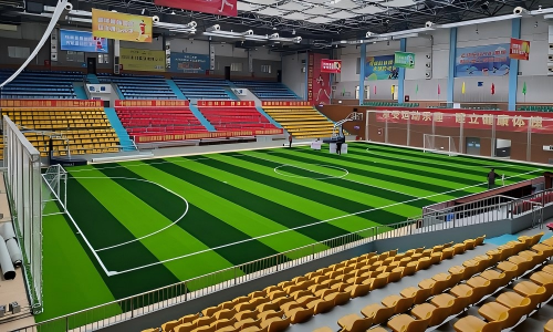 当篮球架缓缓收起,熟悉的木质地板被一片生机盎然的绿色覆盖,旺苍县体育馆的室内篮球场地正经历着一场别开生面的“变身”——通过铺设专业足球草皮,这里成功“跨界”,成为了能够承办足球赛事的活力赛场,为足球爱好者带来了全新的体验。