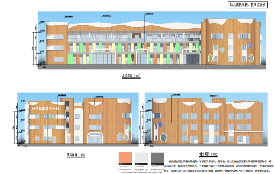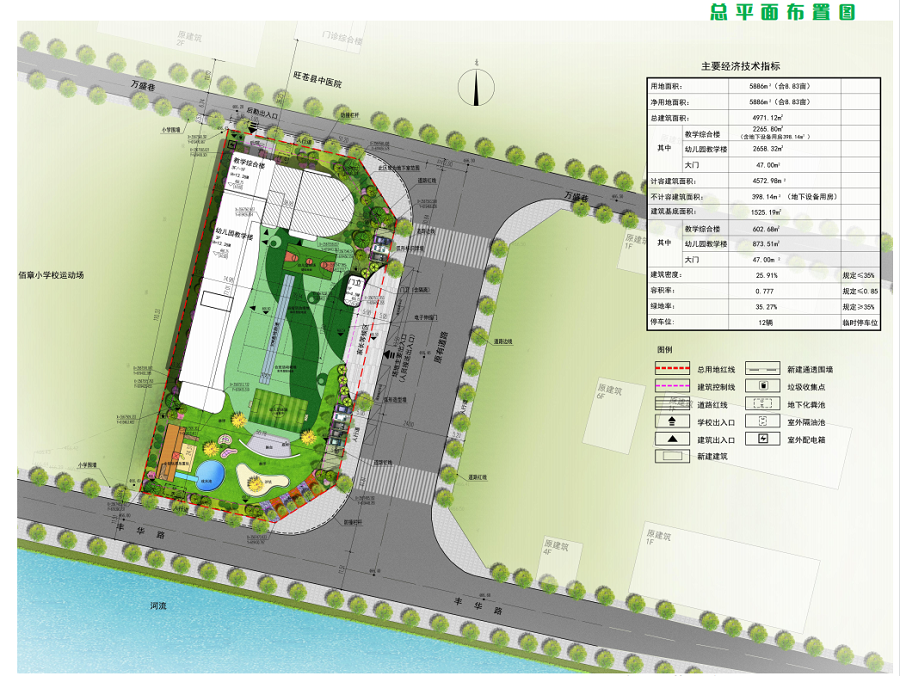拟建方案总经济技术指标为:用地面积5886㎡;总建筑面积4971.12㎡,其中地上计容建筑面积4572.98㎡(教学综合楼2265.8㎡,幼儿园教学楼2658.32㎡,大门47.00㎡),地下建筑398.14㎡;建筑占地面积1525.19㎡;容积率0.777;建筑密度25.91%;绿地率35.27%,停车位12辆。