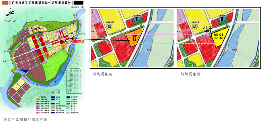 拟调整地块位于广元市旺苍县红旗坝组团,原《广元市旺苍县红旗坝控制性规划设计》中,A3地块用地性质为居住用地(R2)兼 容商业设施用地(B1)。旺苍县城区域现有商业存量已经很大,消费群体相对较小,投资商业的群体信心不足,无法支撑大面积的商业开发建设,B区继续建设,势必造成大体量的商业用房空置,既浪费土地资源,也会对城市 的发展造成负面影响。因此,根据相关规范和要求编制广元市旺苍县嘉川红旗坝控制性详细规划》A3地块调整论证报告。