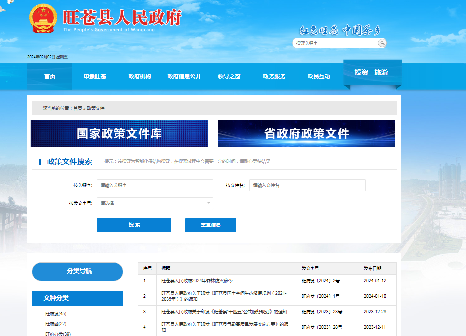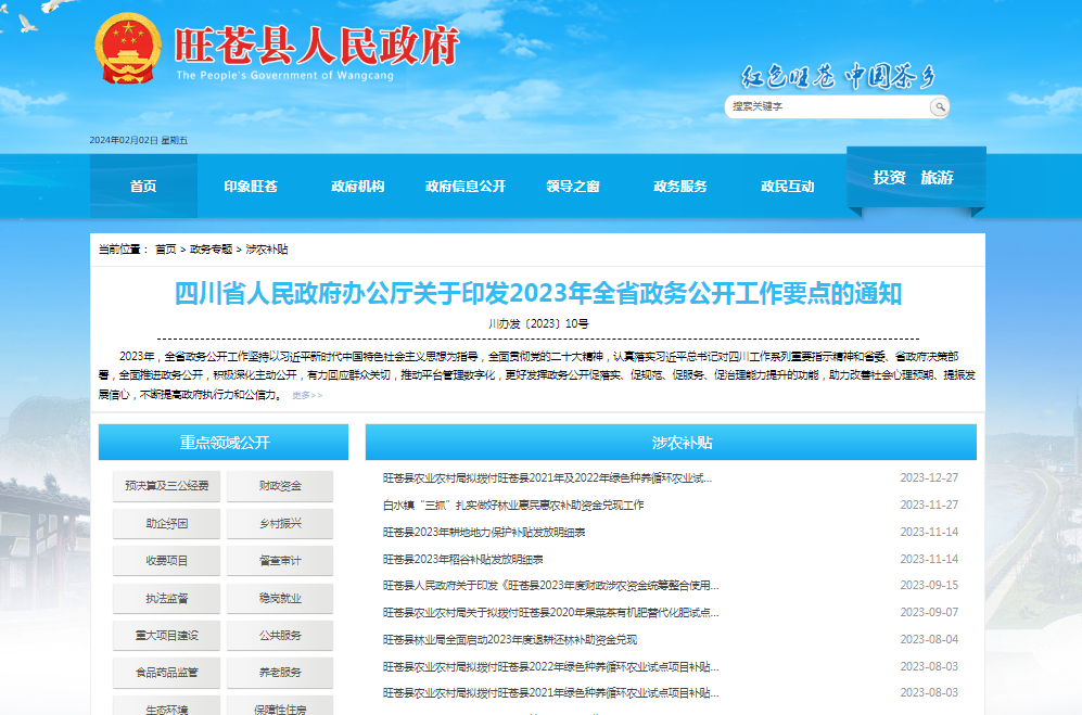 川公网安备 51082102000002号根据《中华人民共和国政府信息公开条例》和省、市有关政府信息公开工作的规定,现公布旺苍县2023年度政府信息公开情况。报告全文包括总体情况、主动公开政府信息情况、收到和处理政府信息公开申请情况、政府信息公开行政复议及行政诉讼情况、存在的主要问题及改进情况、其他需要报告的事项6个部分。报告中所列数据统计期限为2023年1月1日至12月31日。电子版在旺苍县人民政府门户网站(www.scgw.gov.cn)全文公开,如对本报告有疑问,请与旺苍县人民政府办公室政务公开股联系(地址:旺苍县东河镇新华街333号;邮编:628200;电话:0839—4203318)。