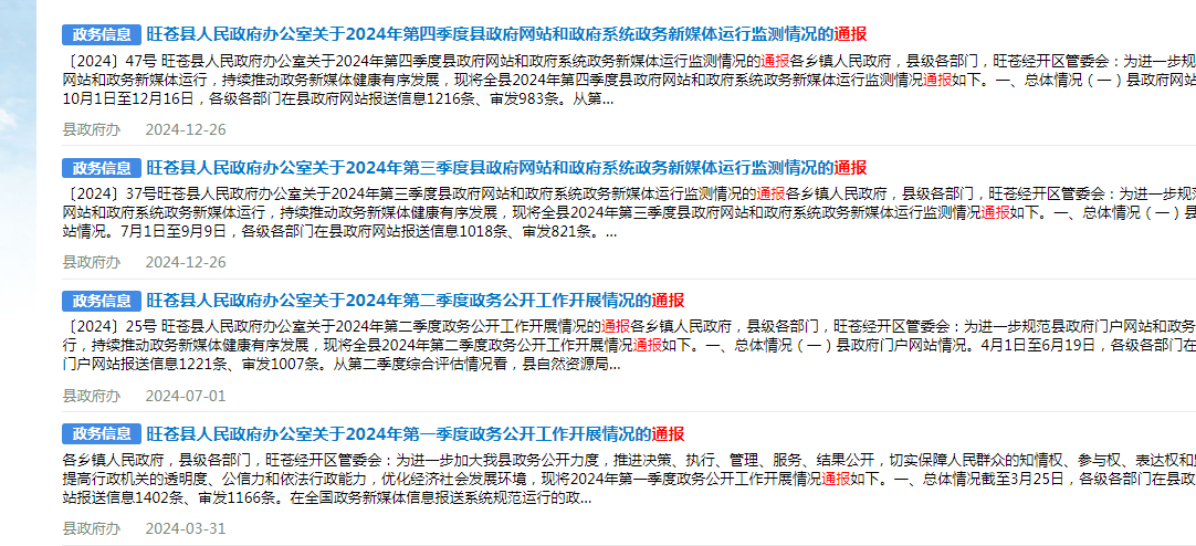 (一)主动公开情况。2024年,通过县政府门户网站累计发布信息6773条,其中,更新概况类信息53条、政务动态信息3469条,主动公开涉及群众切身利益的教育、就业、卫生健康、社会救助等30个重点领域信息共1700余条。通过“旺苍发布”微信、“V旺苍”微博、“旺苍县融媒体中心”抖音等17个政务新媒体平台,及时转载党中央、国务院重要信息、发布全县时政信息共计8500余条。